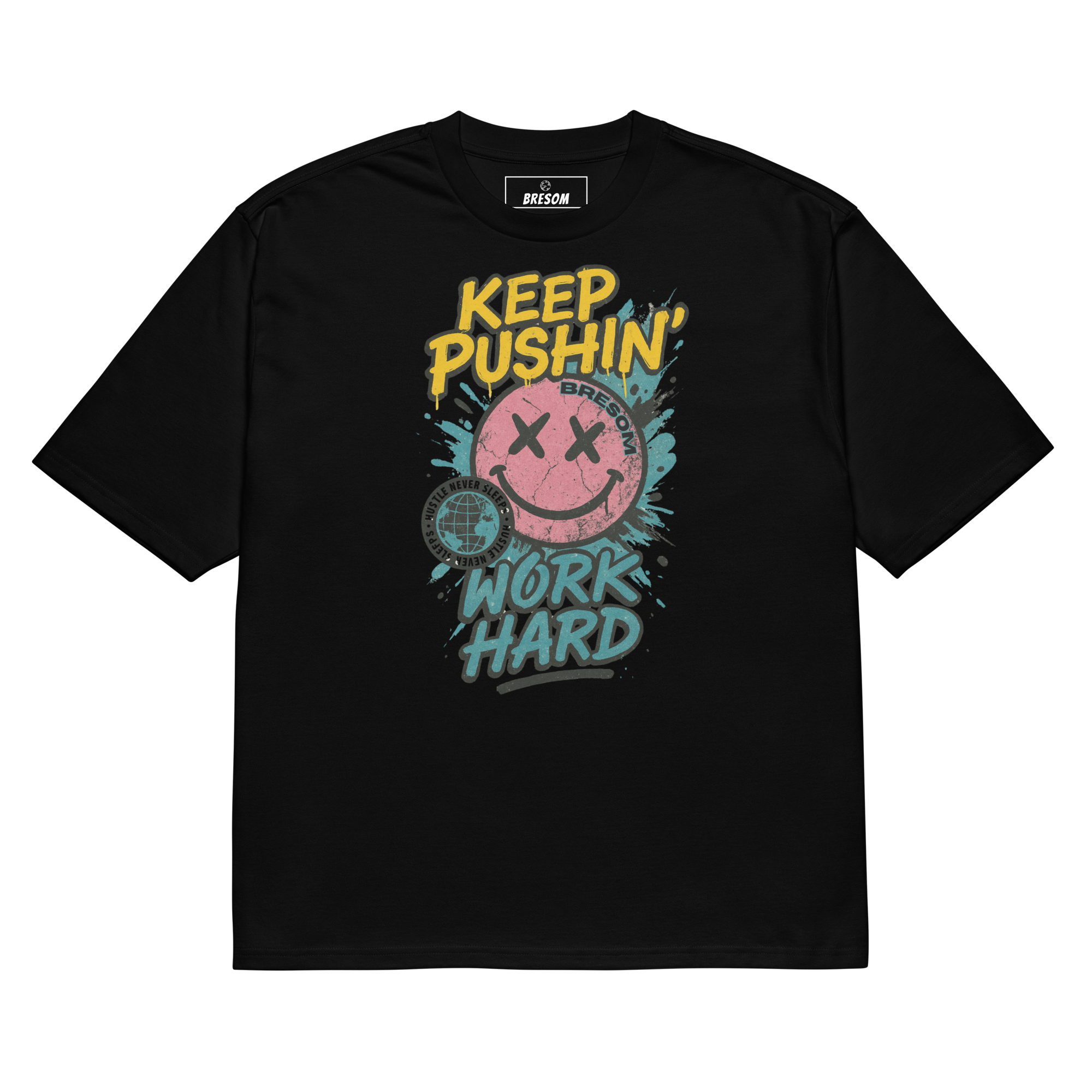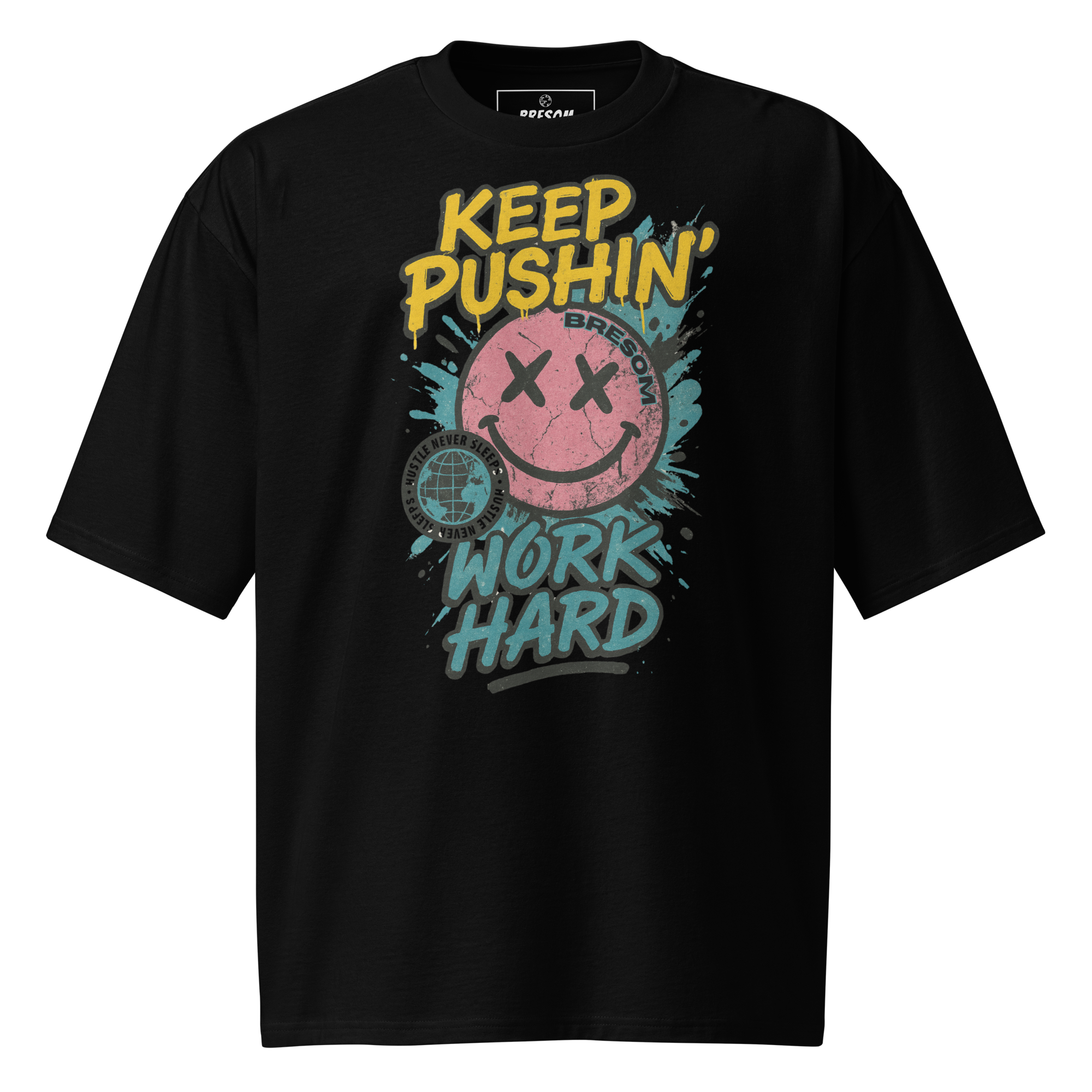 Le visuel mêle une énergie colorée, avec un message brutalement vrai : KEEP PUSHIN’ / WORK HARD.