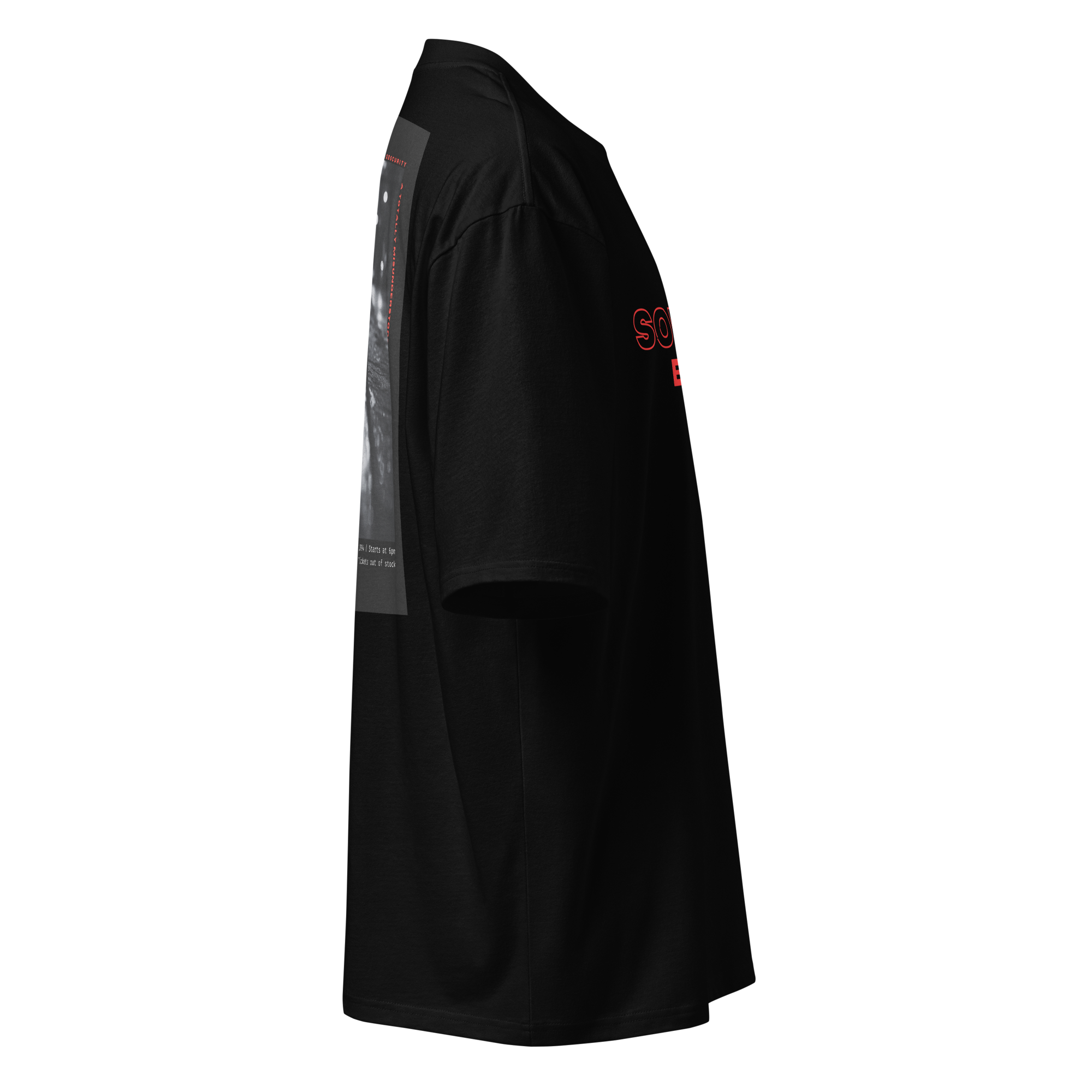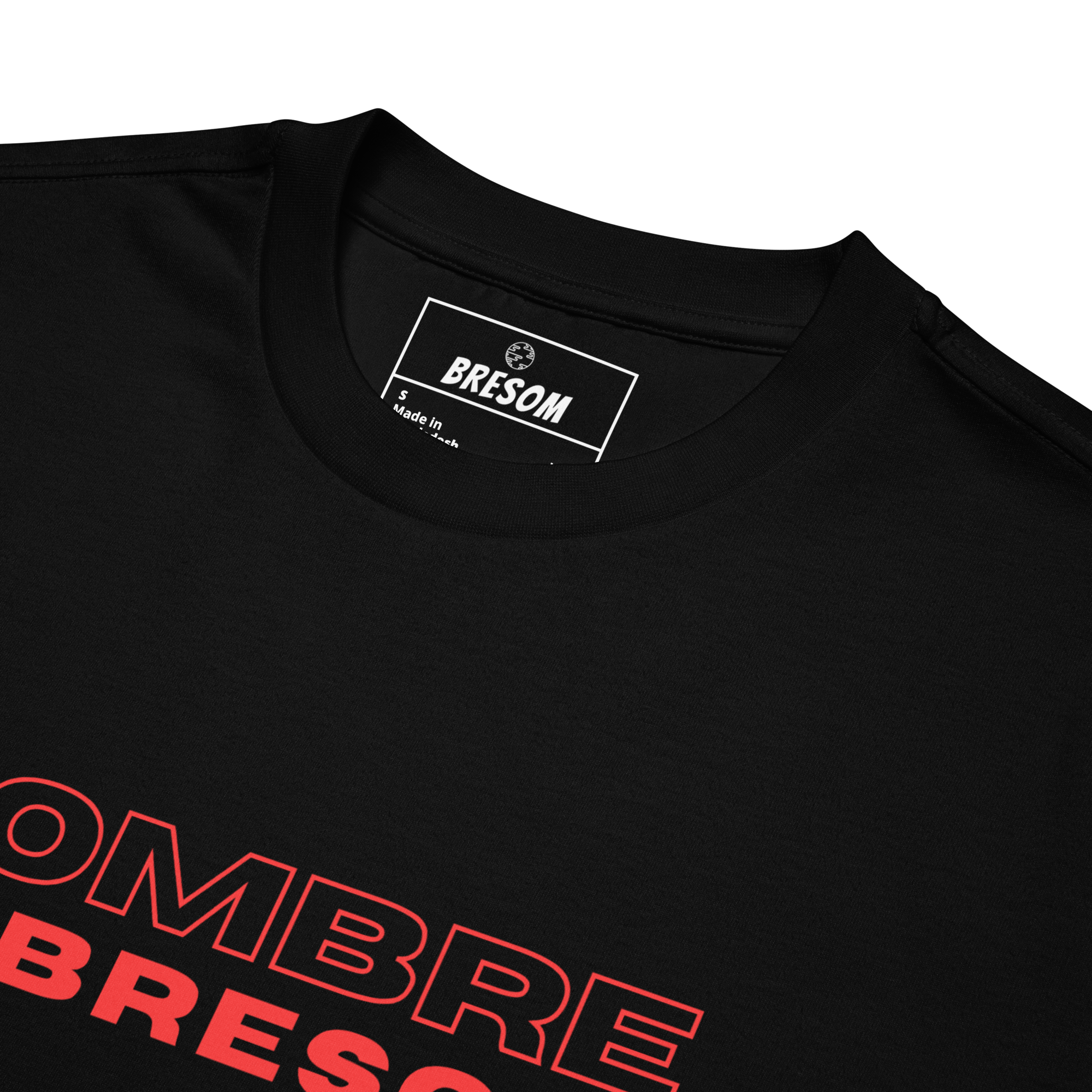 Sur le torse, le mot SOMBRE encadre un BRESOM puissant, en rouge éclatant. Dans le dos, une photo prise en perspective urbaine évoque solitude, tension, silence. C’est un instant figé dans l’obscurité, comme un souvenir flou ou un avertissement discret.